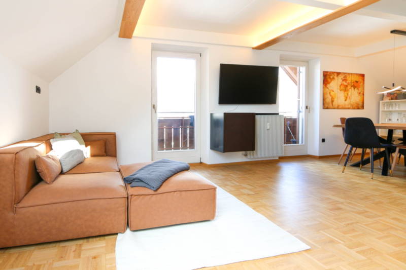 Ein Highlight ist der ausgebaute Dachraum mit Schlafgelegenheit, der den typischen Loftcharakter unterstreicht und ein behagliches, zugleich architektonisch reizvolles Wohngefühl schafft. Das geschmackvoll gestaltete Badezimmer entspricht modernsten Standards und fügt sich nahtlos in das hochwertige Gesamtkonzept ein. Der Balkon bietet zusätzlichen Freiraum und lädt zum Entspannen ein. Die Wohnung wird vollständig möbliert (Ausnahme Bett) übergeben.