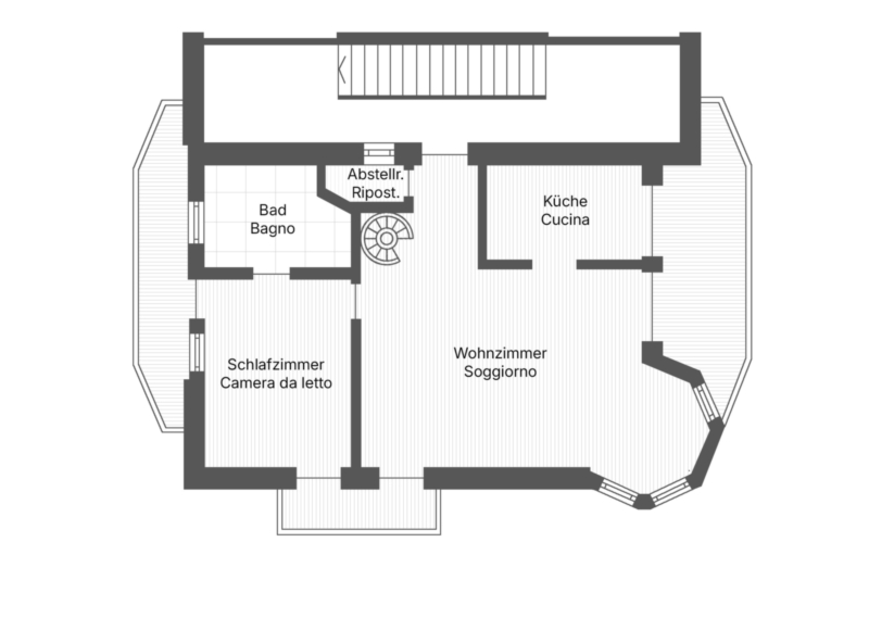 Im zweiten und dritten Stock finden Sie einen lichtdurchflutete Duplexwohnung bestehend aus Wohnbereich mit offener Küche, ein Schlafzimmer, ein Badezimmer, Abstellraum und drei Balkone. Die charmante Mansarde sorgt für eine besondere Gemütlichkeit und zusätzliche Nutzungsmöglichkeiten.