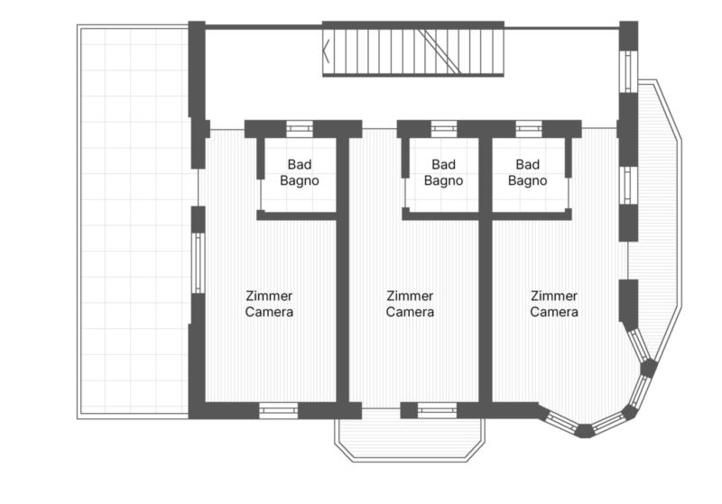 Der erste Stock beherbergt drei großzügige Zimmer, jedes mit eigenem Bad und Balkon.