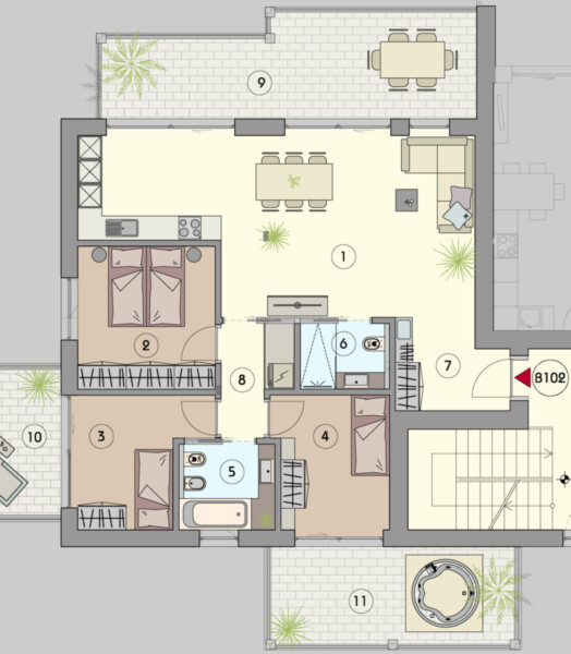 Diese Vierzimmerwohnung im 1. Stock bietet ca. 87 m² Nettowohnfläche mit heller Wohnküche, drei Schlafzimmern, zwei Badezimmer mit Bidet, Dusche und Wanne. Drei Terrassen nach Süden, Westen und Osten garantieren sonnige Außenbereiche zu jeder Tageszeit.
