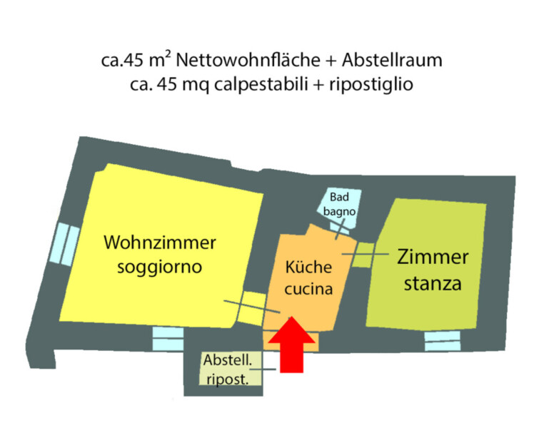 Die Nettowohnfläche von ca. 45 m² gliedert sich in ein Schlafzimmer, ein Wohnzimmer mit Kochecke sowie ein Badezimmer. Ergänzend gehört ein Abstellraum unmittelbar vor der Wohnungseingangstür zur Wohnungseinheit.