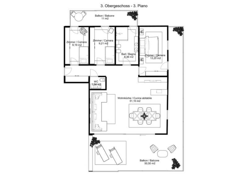 Die Wohnung besteht aus einer großzügigen Wohnküche mit direktem Zugang zur Terrasse, die einen idealen Ort für entspannte Stunden im Freien bietet. Zwei Einzelzimmer verfügen über einen Zugang zum Balkon, ebenso das Badezimmer, was für eine angenehme Belichtung und Belüftung sorgt. Das Doppelschlafzimmer punktet mit direktem Zugang zur Terrasse und bietet einen privaten Rückzugsort mit viel Licht und Weitblick.