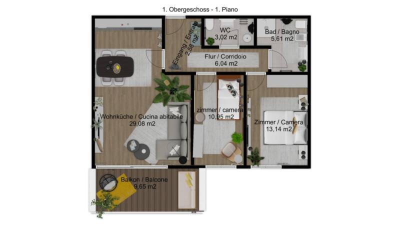 Diese moderne 3-Zimmer-Wohnung im 1. Stock bietet hohen Wohnkomfort in einer ruhigen Umgebung. Der offene Wohnbereich mit integrierter Küche öffnet sich zu einem sonnigen Balkon, ideal, um den Tag entspannt im Freien zu genießen.