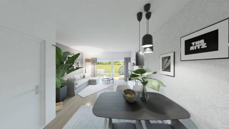 Diese moderne 3-Zimmer-Wohnung im 1. Stock bietet hohen Wohnkomfort in einer ruhigen Umgebung. Der offene Wohnbereich mit integrierter Küche öffnet sich zu einem sonnigen Balkon, ideal, um den Tag entspannt im Freien zu genießen.