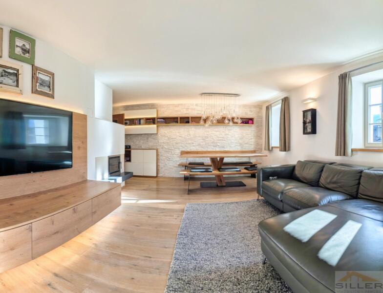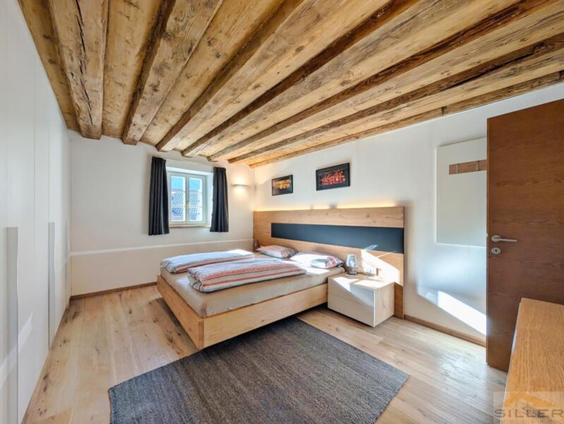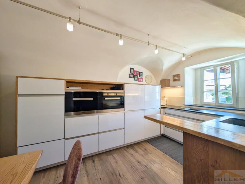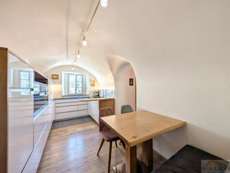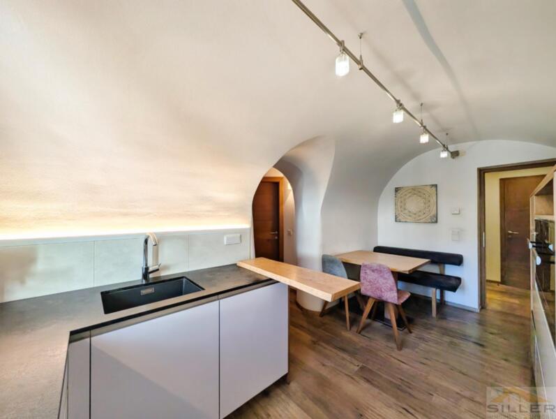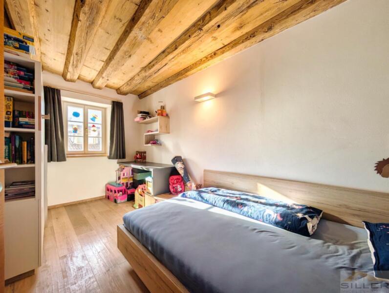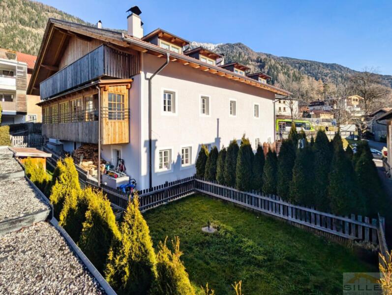 Trens hat sich das Dörfliche bewahrt: vertraute Gesichter, Kinder, die draußen spielen, und kurze Wege zu allem, was wichtig ist. Bank, Bäckerei, Geschäfte, Bushaltestelle, Vereinshaus und Gemeindeämter sind in maximal fünf Gehminuten erreichbar.Mittendrin steht ein denkmalgeschütztes Haus mit Wandmalereien, Gewölben und alten Holzbalken im Inneren – ein Gebäude nicht von der Stange, eines, das man nicht nachbauen kann.Die Wohnung erschließt sich ebenerdig und liegt talseitig im ersten Stock. Darunter öffnet sich ein privater Garten, der zur Wohnung gehört. Hinten das Dorfleben, vorne Ruhe im Grünen.Im Inneren erwartet Sie keine Standardausstattung, sondern die Handschrift eines Innenarchitekten: maßgefertigte Möbel in Küche und Schlafzimmern, ein großzügiges Wohnzimmer mit gemauertem Kaminofen sowie eine Wohnküche unter historischem Gewölbe. Drei Schlafzimmer bieten Platz für die Familie, zwei Bäder – eines davon mit Fenster – sorgen für entspannte Morgen.Eine hölzerne Veranda verbindet Innen- und Außenbereich, Keller und Garten runden das Angebot ab. Ein Stellplatz für zwei Fahrzeuge ist optional erwerbbar.Wer hier einzieht, kauft nicht nur eine Wohnung, sondern ein Stück echtes und einzigartiges Trens.