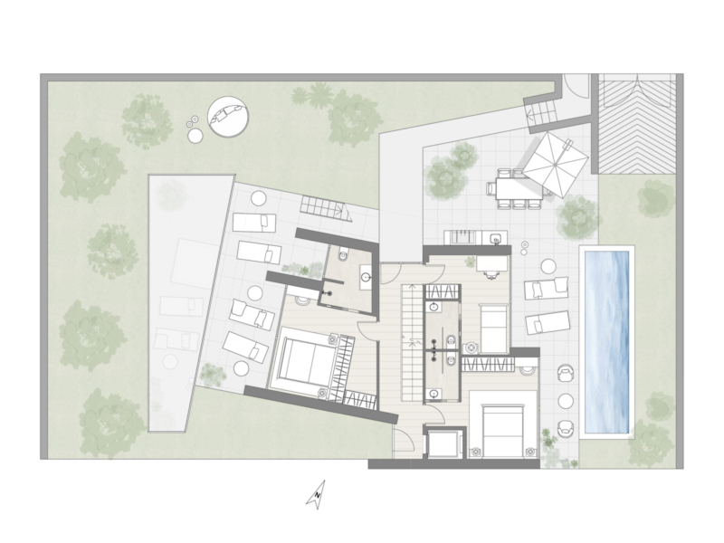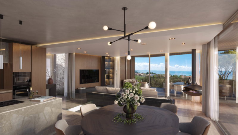 Die Innenräume überzeugen durch eine moderne und durchdachte Raumaufteilung: ein lichtdurchfluteter Wohnbereich, elegante Schlafzimmer und stilvolle Bäder. Im Erdgeschoss gelangt man direkt in den privaten Garten mit einem exklusiven Pool – ideal zum Entspannen in vollkommener Privatsphäre. Im Obergeschoss lädt eine große Panoramaterrasse dazu ein, den atemberaubenden Seeblick zu genießen – ein echtes Highlight.