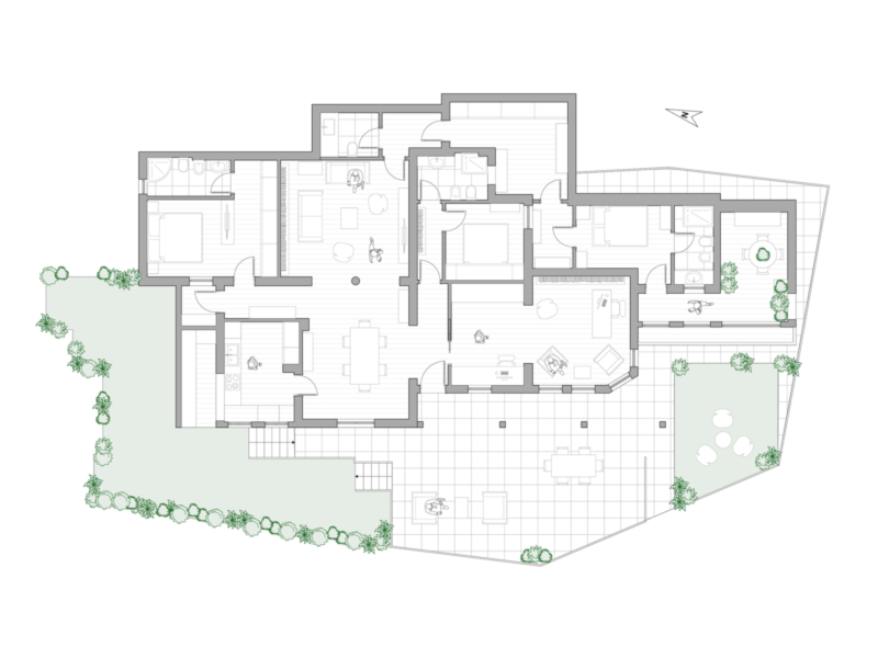 Der Schlafbereich umfasst drei Zimmer und zwei helle Badezimmer, die hohen Komfort und praktische Nutzung garantieren. Ergänzt wird das Angebot durch eine Taverne, einen Hauswirtschaftsraum sowie eine separate Dependance mit Schlafzimmer, Bad und Wohnbereich – ideal für Gäste oder Kurzzeitaufenthalte.