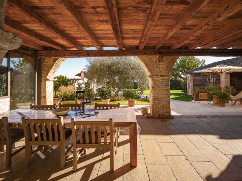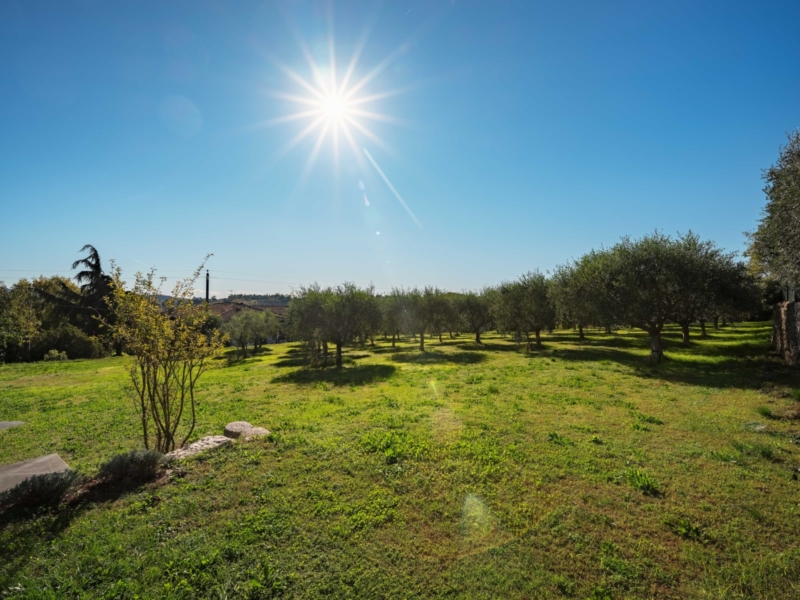 Jede Einheit verfügt über einen eigenen Zugang sowie helle, großzügig geschnittene Räume, die durch klare Linien und eine harmonische Verbindung von Tradition und Moderne überzeugen. Hohe Decken mit sichtbaren Holzbalken, Terrakottaböden und Natursteinwände verleihen den Innenbereichen eine warme, authentische Ausstrahlung. Besonders hervorzuheben ist die Hauptwohnung, die mit ihrem großzügigen Grundriss und repräsentativen Wohnbereichen als stilvolles Herzstück des Anwesens besticht. Der weitläufige Hain mit alten Oliven, gepflegten Wiesen und üppiger Bepflanzung umrahmt das Anwesen und prägt seinen unverwechselbaren Charakter.