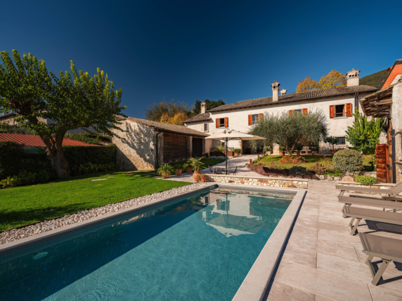 Sonnige Terrassen, großzügige Liegeflächen und ein elegant gestaltetes Schwimmbad fügen sich harmonisch in die Landschaft ein. Mehrere Stellplätze bieten komfortable und sichere Parkmöglichkeiten.