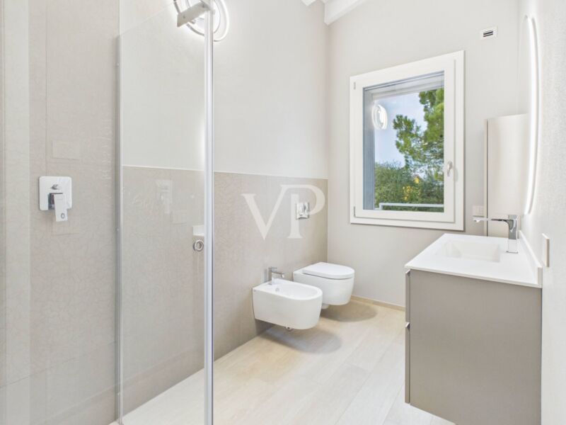 Die Villa mit einer Nutzfläche von 361 m² (300 m² Bodenfläche) erstreckt sich über zwei oberirdische Ebenen und ein Untergeschoss und genießt eine volle Belichtung, die für Helligkeit und Atmosphäre zu jeder Tageszeit sorgt. Die großen Fenster und die Harmonie zwischen Innen- und Außenbereich unterstreichen den eleganten und modernen Stil der gesamten Residenz.