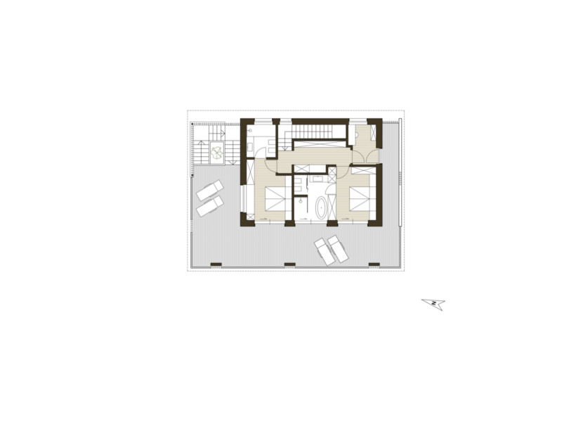 Das Obergeschoss umfasst zwei Schlafzimmer, zwei Badezimmer, ein Büro sowie eine weitere Terrasse, die zusätzlichen Wohn- und Rückzugsraum mit attraktiven Außenbezügen bietet.