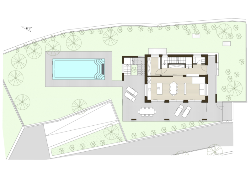 Im Erdgeschoss befindet sich ein großzügiger Wohnbereich mit direktem Zugang zur Garten-Terrasse und zum privaten Pool, ein Badezimmer sowie ein praktischer Waschraum.