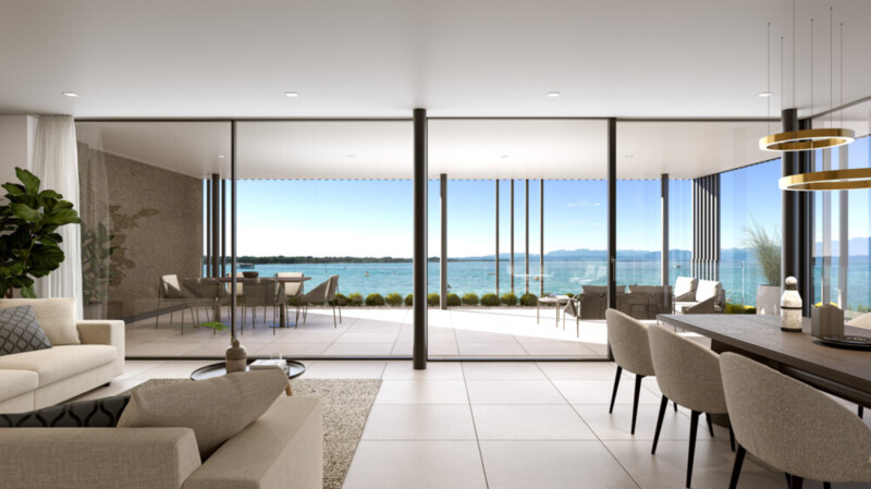 Die großzügigen Wohnungen verfügen entweder über große Privatgärten oder über großzügige Terrassen. Alle Wohneinheiten bieten einen Blick auf den See.