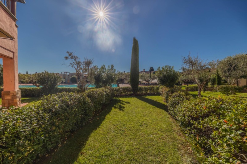Besonders hervorzuheben sind die großen Außenbereiche: Eine überdachte Terrasse (Portico) mit gemauertem Grillplatz lädt zum Entspannen und geselligen Beisammensein ein. Ergänzt wird sie durch zwei private Gärten, die sich auf der Süd- und Nordseite der Wohnung befinden und sowohl Sonne als auch Schatten bieten – ideal für jede Tageszeit.
