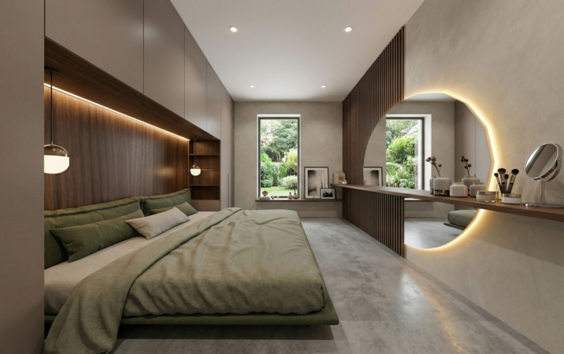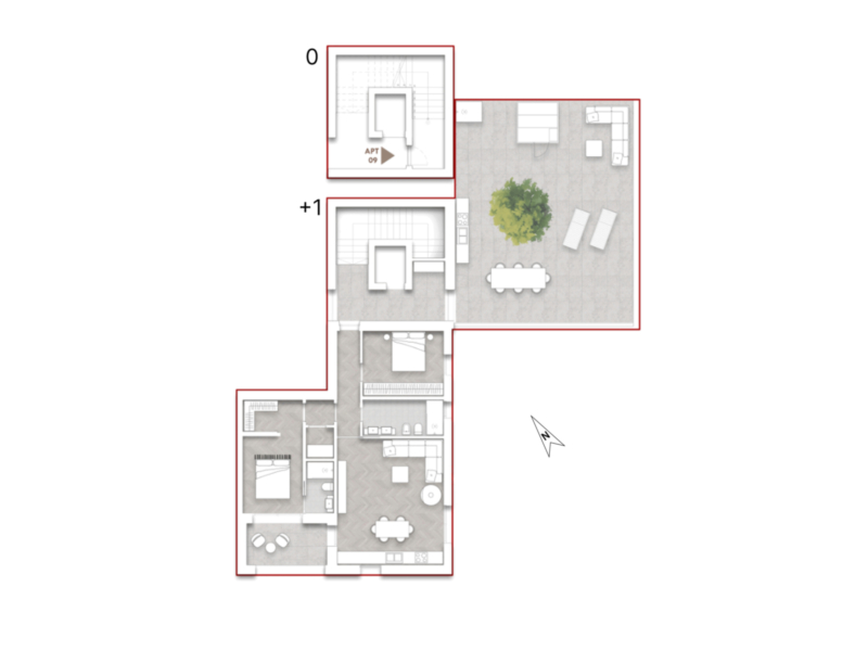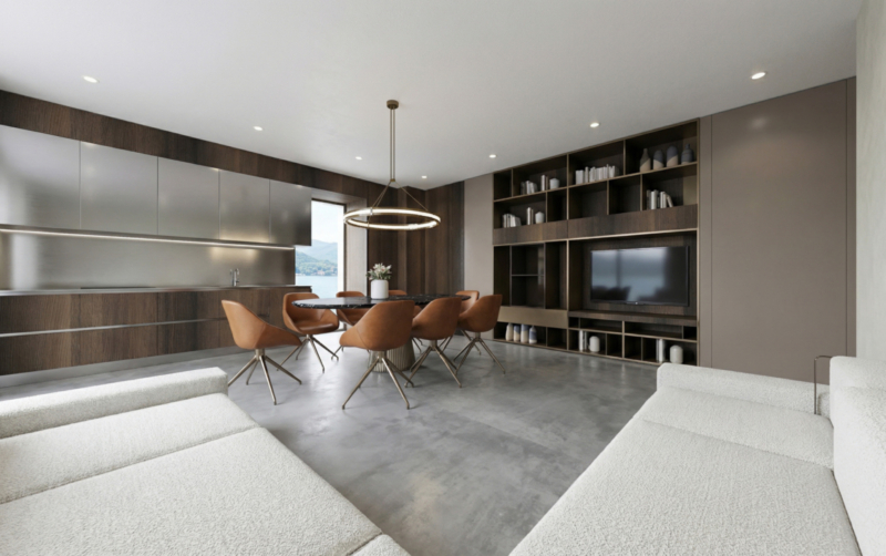 Der großzügige Wohnbereich öffnet sich auf eine große Terrasse mit Seeblick, die optional mit einer Außenküche ausgestattet werden könnte, perfekt für Mahlzeiten im Freien und entspannte Stunden.