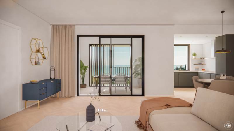 Das offene Wohnzimmer, das vom separaten Essbereich und den Abstellraum durch eine Wand getrennt ist, führt zu einer großen Terrasse, ideal für Mahlzeiten im Freien und Entspannung.