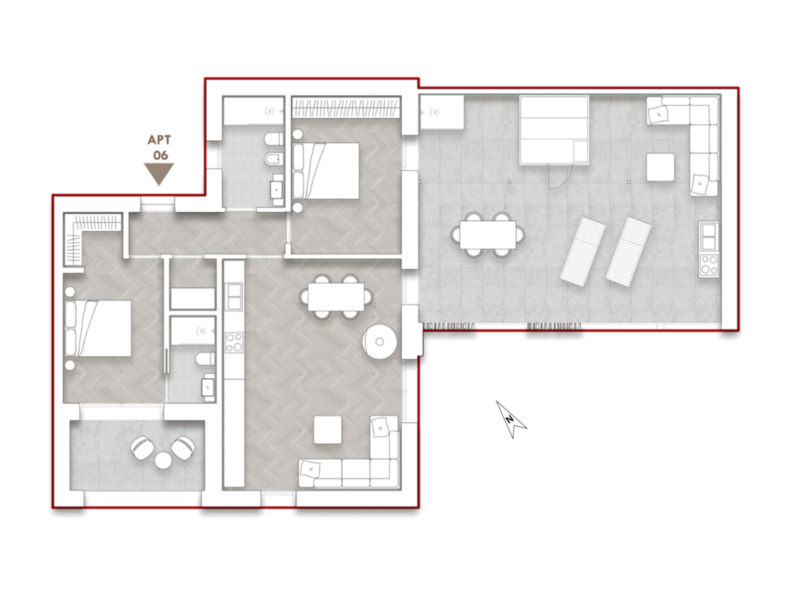 Die Wohnung verfügt über zwei Schlafzimmer, eines davon mit eigenem Bad en Suite, ein zweites Bad steht ebenfalls zur Verfügung.