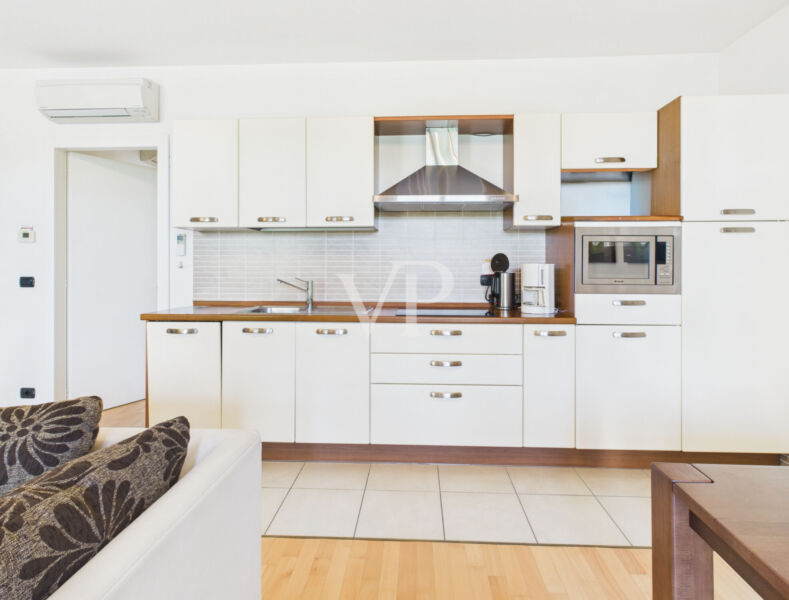 Residenz "I Molini" - Helle Wohnung im Erdgeschoss, modern eingerichtet. Wohnbereich mit Wohn-/Esszimmer, Sat-TV und Klimaanlage; komplette offene Küche (Backofen, Geschirrspüler, 4-Flammen-Induktionskochfeld, Mikrowelle). Ausgang zur Terrasse und zum großen Privatgarten mit Gartenmöbeln.