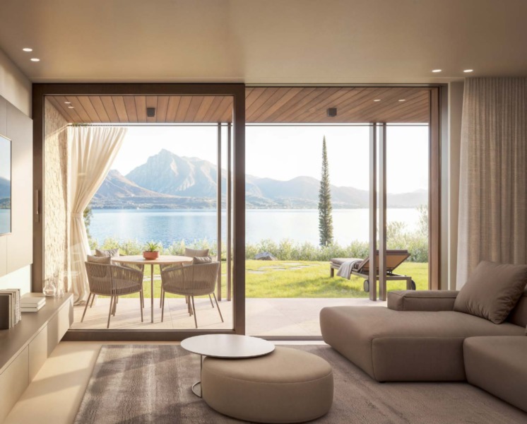 Die Architektur fügt sich harmonisch in die grüne, erhöhte Hanglage ein und eröffnet durch große Glasfronten und perfekt ausgerichtete Außenflächen einen traumhaften Blick über den Gardasee.