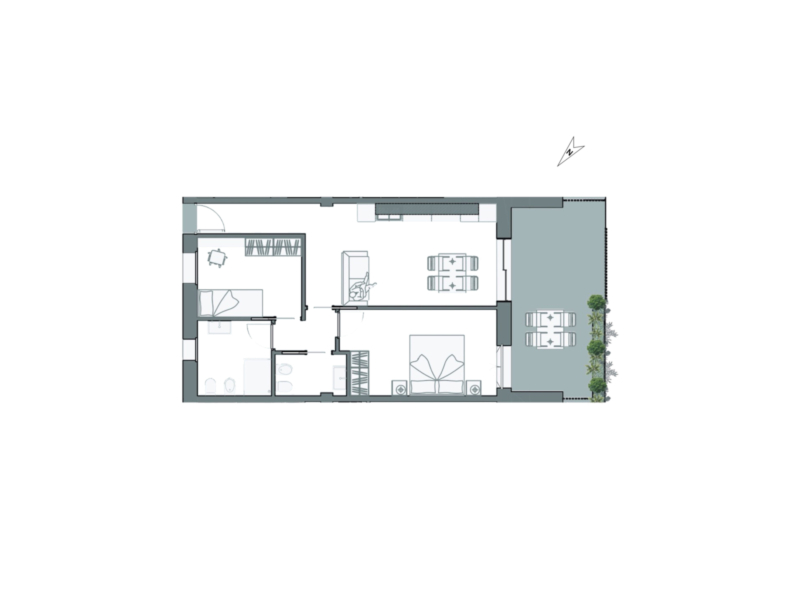 Diese 3-Zimmer-Terrassenwohnung mit privater Dachterrasse verfügt über eine Wohnküche, zwei Schlafzimmer, ein Badezimmer sowie ein separates Gäste-WC.