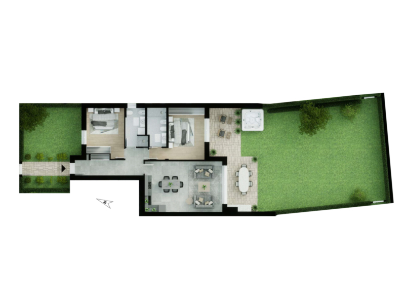 Diese bezugsfertige Neubauwohnung verfügt über einen großzügigen Wohnbereich mit offener Küche, der direkten Zugang zur Terrasse und zum weitläufigen Garten bietet – von beiden genießt man einen wunderschönen Seeblick. Ergänzt wird die Wohnung durch zwei Schlafzimmer, zwei Badezimmer sowie einen Eingangsbereich mit Garderobe.