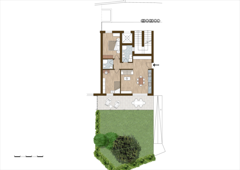 Bei der Wohnung 02 handelt es sich um eine 3- Zimmerwohnung im Erdgeschoss bestehend aus: Eingang, Wohnzimmer mit Küche, 2 Schlafzimmer, 2 Badezimmer, Terrasse, Garten und Keller. Gegen Aufpreis kann die Immobilien von der Bindung "Wohnung für Ansässige" freigestellt werden.