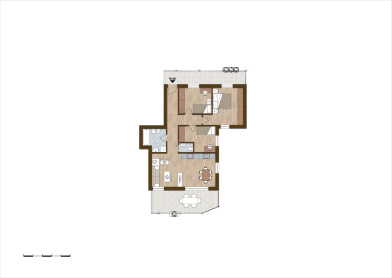 Bei der Wohnung 08 handelt es sich um eine 4- Zimmerwohnung im ersten Stock bestehend aus: Eingang, Wohnzimmer mit Küche, 3 Schlafzimmer, 2 Badezimmer, Terrasse und Keller. Gegen Aufpreis kann die Immobilien von der Bindung "Wohnung für Ansässige" freigestellt werden.