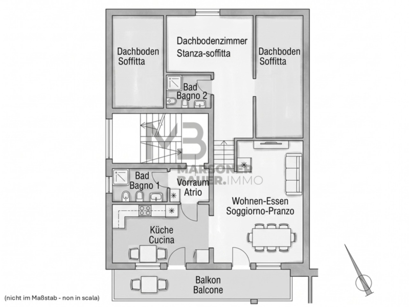 Dachgeschoss: Eingangsdiele, Dusche-W.C., Wohnküche, Wohnraum mit Zugang zu einem Südbalkon, kurze Treppe in den hinteren Dachgeschossbereich dort haben sich die Eigentümer ein Schlafzimmer mit einer Dusche-W.C. errichtet sowie zwei Dachräume. Der hintere Dachgeschossbereich ist als nicht bewohnbarer Dachraum eingetragen.