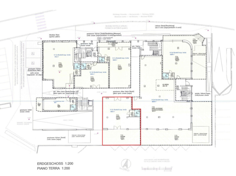 Das WC und die Garage im 1. Untergeschoß werden von der Gemeinde Lana öffentlich bewirtschaftet, mit dem Recht der Kunden der Handels- Gastronomie- und Geschäftslokale vom Gebäude, für eine Stunde gratis zu parken.