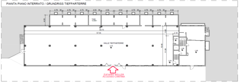 Der Anlieferungsbereich erfolgt über eine Zufahrtsrampe, welche sich neben dem Gebäude befindet und auch mit Lastkraftwagen befahrbar ist. Direkt im Anschluss an die Rampe befindet sich der Zugang zur Halle über eine separate Eingangstür sowie über ein groß dimensioniertes Rolltor, welches einen komfortablen Zugang für Warenbewegungen, Palettenverkehr oder größere Fahrzeuge ermöglicht. Die Lagerhalle verfügt über eine Gesamtlänge von ca. 60 Metern sowie eine Breite von ca. 15 Metern und bietet damit großzügige Nutzflächen für Lagerung, Umschlag oder betriebliche Nutzung. Die Hallenhöhe beträgt ca. 5 Meter, wodurch auch eine effiziente Lagerung mit Regalsystemen oder Stapeltechnik möglich ist.