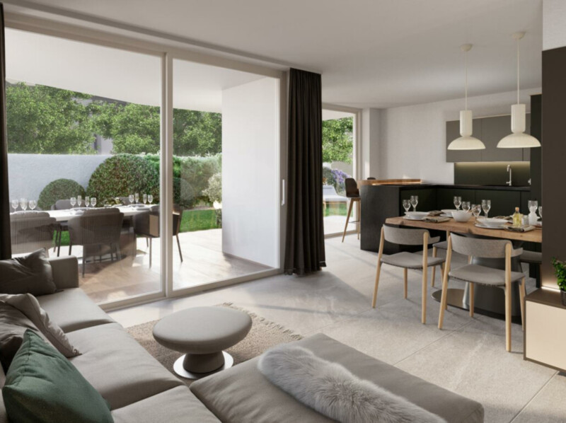 In dieser modernen und hochwertigen Wohnanlage steht eine großzügige Vierzimmerwohnung mit Terrasse und Privatgarten zum Verkauf – mit einer beeindruckenden Nettofläche von knapp 215 m².