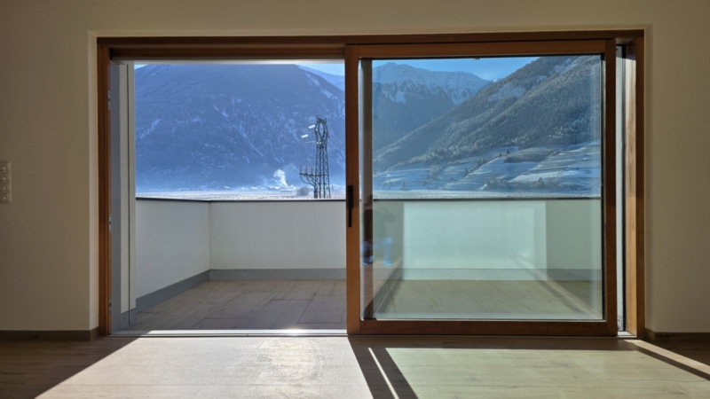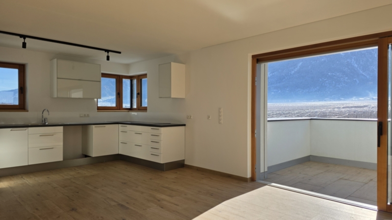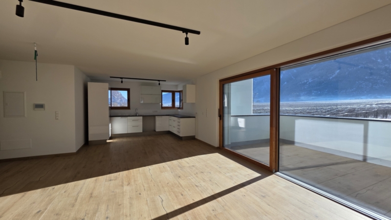 Der weitläufige Wohnraum bildet das Herzstück der Wohnung. Große Glasfronten öffnen den Raum zur sonnigen Terrasse und schaffen eine fließende Verbindung zwischen Innen und Außen. Die Südausrichtung garantiert ganztägig helle, freundliche Wohnatmosphäre und ein einzigartiges Raumgefühl.