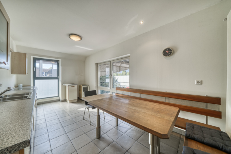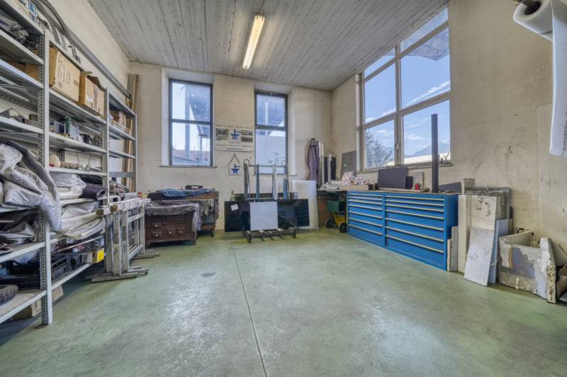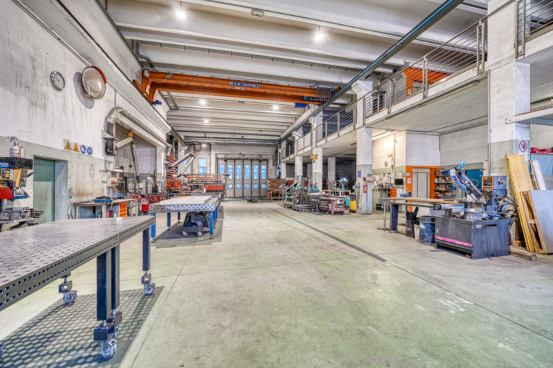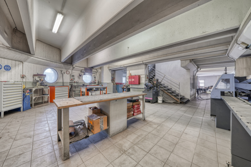 Im Erdgeschoss befindet sich eine großzügige Produktionshalle mit einer Fläche von ca. 574 m² sowie einer lichten Raumhöhe von rund 7,00 m. Die Halle ist über ein groß dimensioniertes Falttor sowie über einen separaten Personenzugang erschlossen. Ein installierter Brückenkran unterstützt effizient die interne Warenlogistik und Produktionsabläufe.
