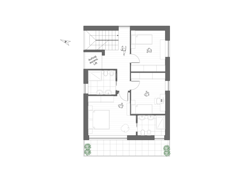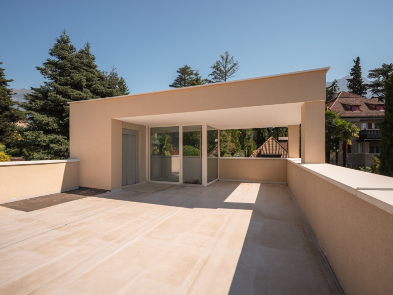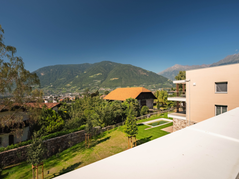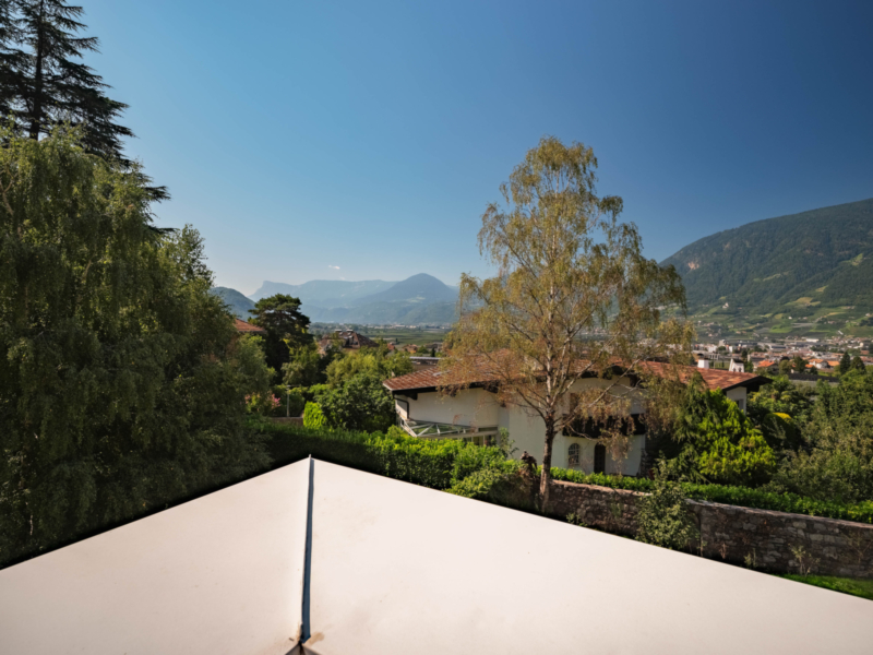 Im Innenbereich kann der Käufer sämtliche hochwertigen Materialien individuell auswählen, darunter Böden, Fliesen, sanitäre Anlagen und Türen, sodass das Haus perfekt auf persönliche Wünsche abgestimmt werden kann. Die Villa verfügt über einen Aufzug im gesamten Haus, eine Dachterrasse mit wunderschöner Aussicht über das Burggrafenamt sowie ein Untergeschoss mit Garage mit fünf Stellplätzen, Hobbyraum und Kellerräumen.
