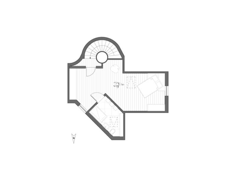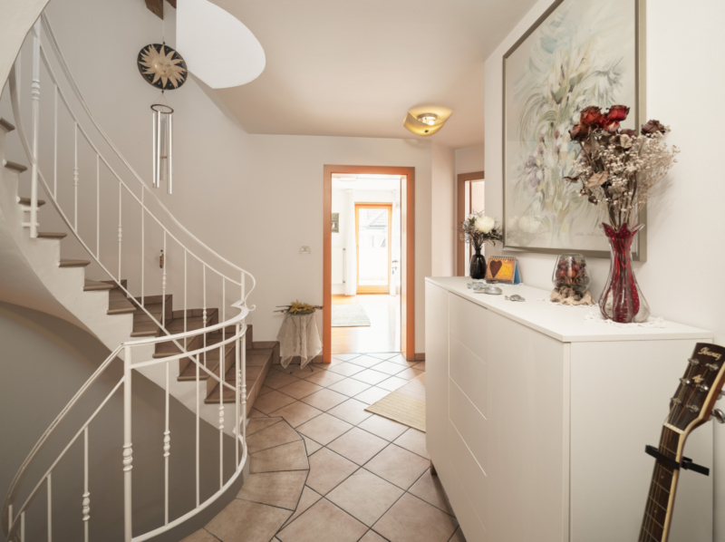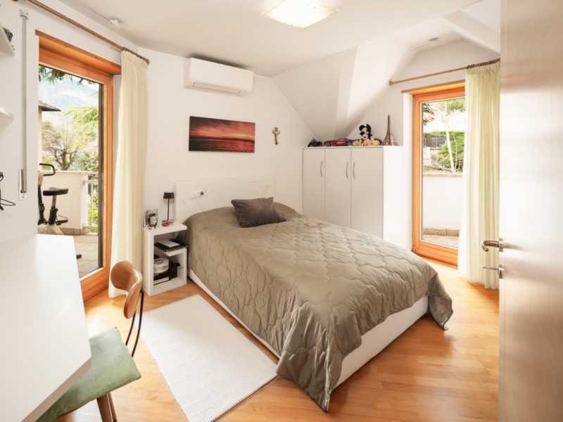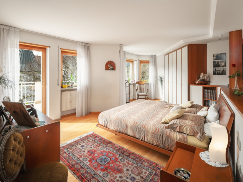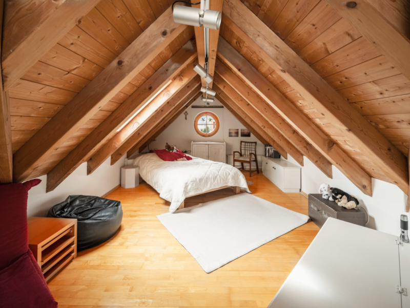 Im Obergeschoss stehen drei geräumige Schlafzimmer zur Verfügung, jeweils mit Zugang zu einem Außenbereich – eine große Terrasse sowie zwei Balkone. Das Dachgeschoss ist flexibel nutzbar, etwa als Arbeits- oder Hobbybereich.