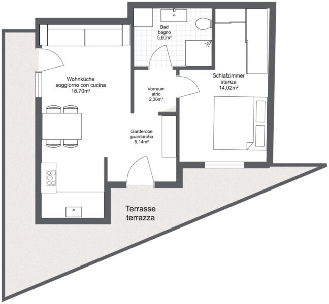 - einen Wohnraum mit integrierter Küche und direktem Zugang zur Terrasse