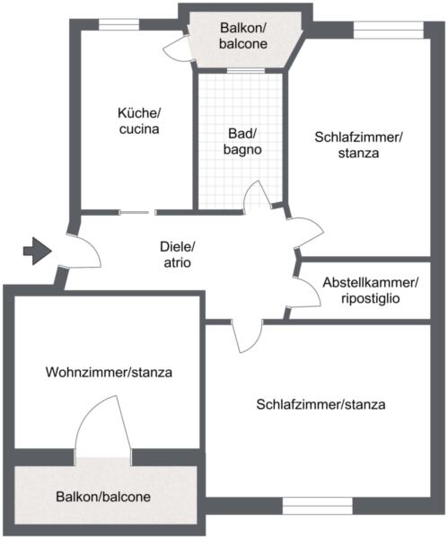 Sie besteht aus einer Küche mit nordöstlich ausgerichtetem Balkon, einem Wohnzimmer mit südwestlichem Balkon, zwei Schlafzimmern, einem Badezimmer mit Fenster und Badewanne sowie einer Abstellkammer.