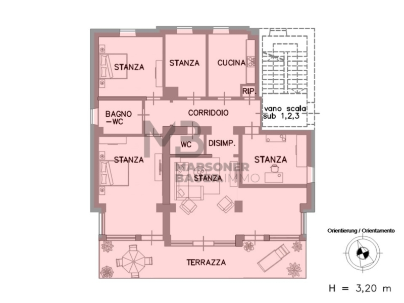 Hochparterre: großzügige Eingangsdiele, Garderobe, Wohnküche, 4 Schlafzimmer bzw. Studio oder Arbeitszimmer, Wohnraum an der Südseite mit Zugang zur ca. 30 m² großen Terrasse mit Südausrichtung, Tages-W.C. und Bad-W.C. mit Fenster;