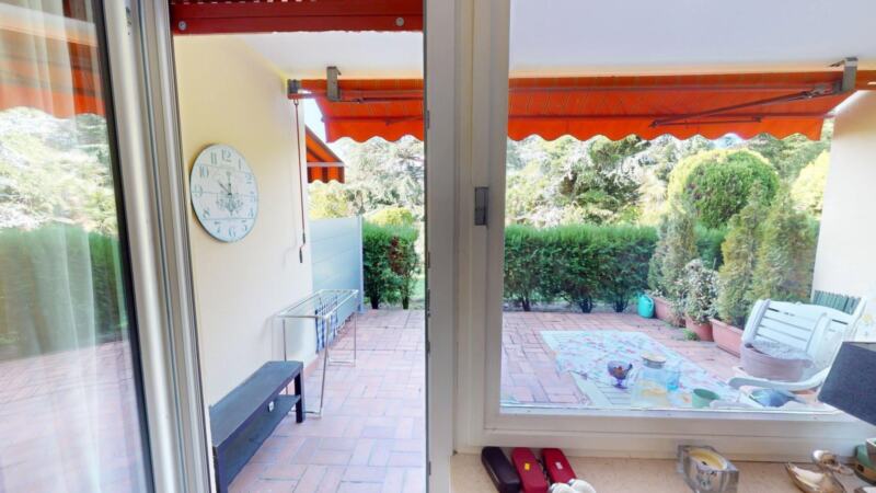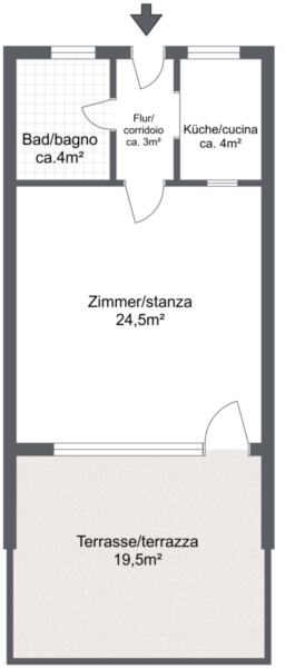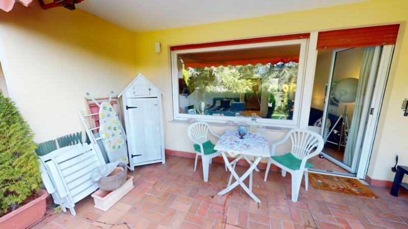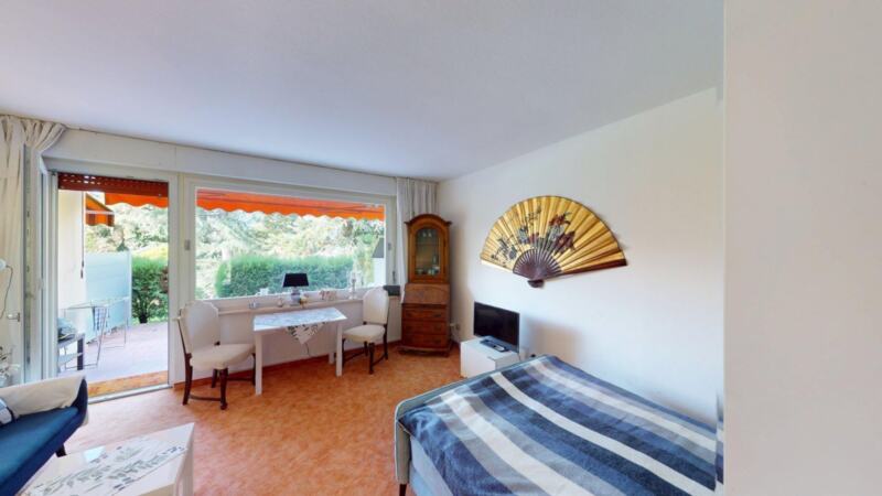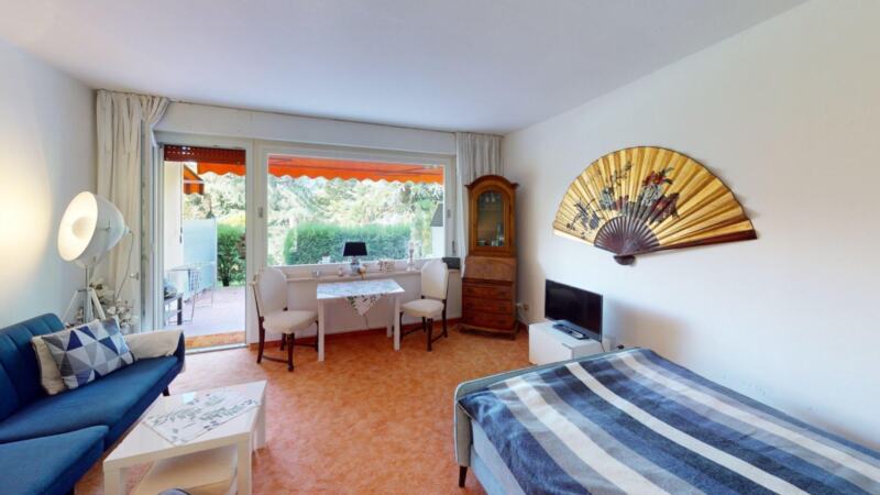Die Wohnung besteht aus einem großzügigen Zimmer mit direktem Zugang zur sonnigen Süd-West-Terrasse, einer separaten Küche sowie einem Badezimmer mit Dusche und Fenster. Von der Terrasse aus gelangt man unmittelbar in den gepflegten, gemeinschaftlichen Gartenbereich, der über einen schönen Außenpool verfügt und allen Bewohnern des Kondominiums zur Verfügung steht.