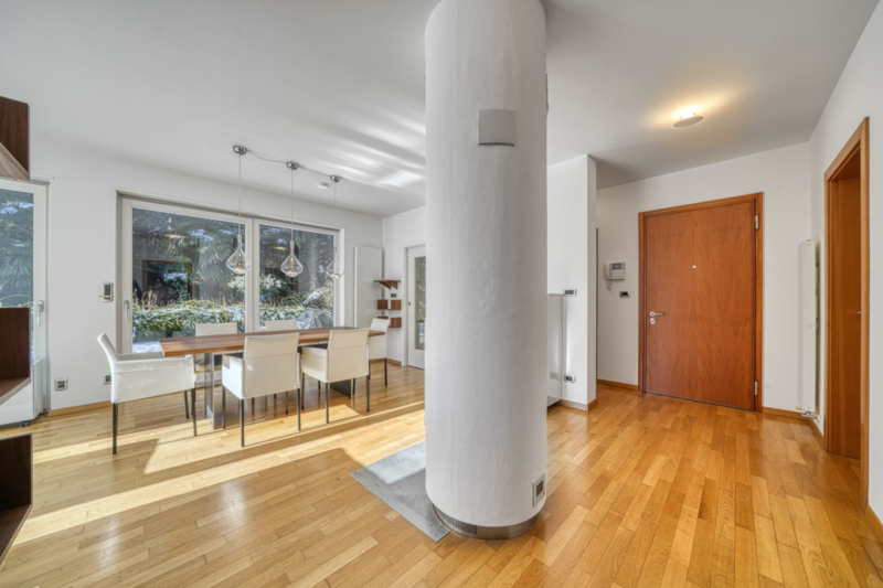 Eingebettet in weitläufige Wiesen und den Park des historischen Schlosses Rubein liegt diese besondere Erdgeschosswohnung in der Christomannosstraße – einer der begehrtesten Wohnlagen von Obermais. Die ruhige Einbahnstraße, geprägt von eleganten Villenanwesen, historischen Gebäuden und altem Baumbestand, bietet ein außergewöhnlich hohes Maß an Privatsphäre, Ruhe und Lebensqualität.Bereits beim Betreten der Wohnung stellt sich ein Gefühl von Großzügigkeit und Helligkeit ein. Der lichtdurchflutete, weitläufige Wohn- und Essbereich bildet das Herzstück der Wohnung. Großzügige Fensterflächen schaffen eine offene, freundliche Atmosphäre, während ein zentral platzierter Holzofen in eleganter Säulenform dem Raum Wärme und einen unverwechselbaren Charakter verleiht. Links vom Eingangsbereich befinden sich das Badezimmer mit Fenster und Dusche/Badewanne sowie ein weiteres Zimmer mit direktem Zugang in den Garten, das sich ideal als Kinderzimmer, Gästezimmer oder Homeoffice eignet. Geradeaus öffnet sich das großzügige Eckschlafzimmer mit zwei Balkontüren nach Osten und Süden,ein Raum, der vom ersten Morgenlicht bis zur warmen Sonne des Tages von Licht durchflutet wird. Auf der rechten Seite des Eingangsbereichs ergänzt ein separates Tages-WC den durchdachten Grundriss. Die hochwertig und vollständig möblierte Küche, ebenfalls rechts vom Essbereich gelegen, überzeugt mit einem Fenster zum Garten, funktionalen parallelen Küchenzeilen sowie neuwertigen Markengeräten in bester Qualität. Von der Küche wie auch vom Wohnbereich aus gelangen Sie direkt in den Garten, der die Wohnung von Osten, Süden und Norden umschließt. Ein Teil des Außenbereichs ist durch den darüberliegenden Balkon überdacht und bietet einen geschützten Platz für entspannte Stunden im Freien. Der unverbaute Blick Richtung Südosten eröffnet ein beeindruckendes Panorama auf Meran 2000 und die Tschöggelberger Berge,ein Ausblick, der Ruhe, Weite und Inspiration schenkt. Der Garten lädt zu einem Frühstück im Freien ebenso ein wie zu geselligen Grillabenden mit Familie und Freunden. Zur Wohnung gehören ein Kellerraum im ersten Untergeschoss sowie zwei Garagen, die bequem über eine Rampe von der Christomannosstraße aus erreichbar sind. Die Wohnung wird vollständig möbliert übergeben.