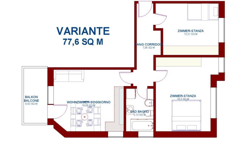 Flexible Raumgestaltung – Dank der Möglichkeit einer Wohnküche lässt sich die Wohnung ideal auf individuelle Bedürfnisse anpassen, sodass auch kleine Familien mit zwei Schlafzimmern Platz finden.
