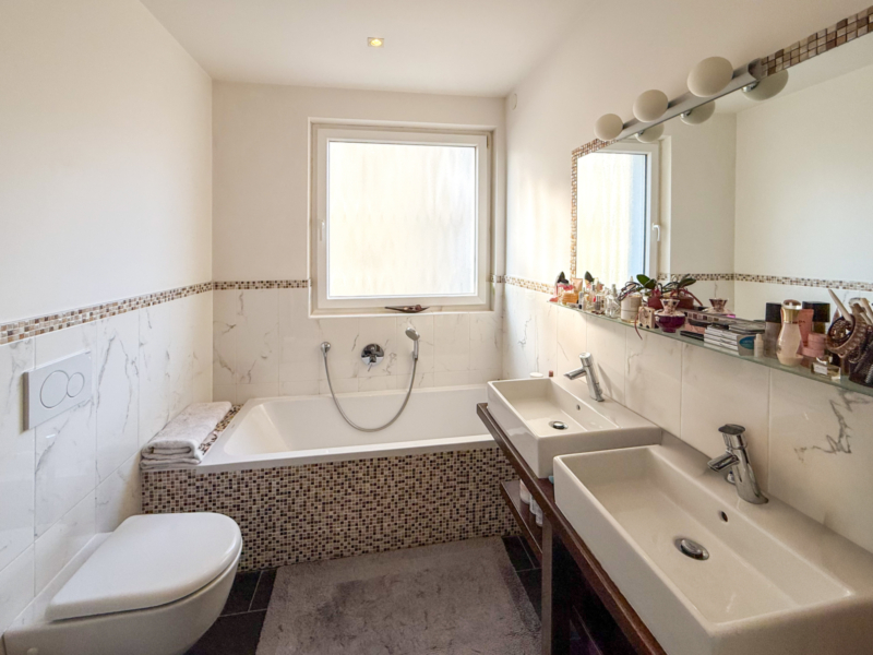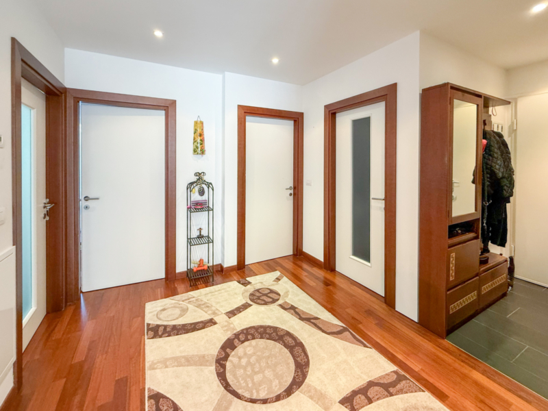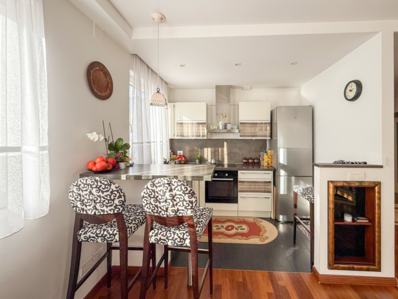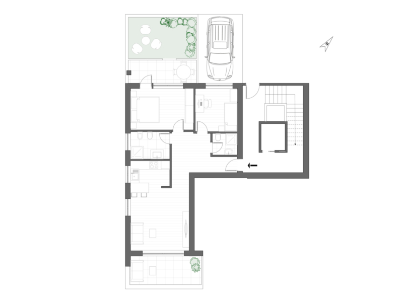 Diese Wohnung verfügt über einen klar gegliederten Grundriss. Vom Flurbereich aus gelangt man zu den zwei Schlafzimmern, von denen eines direkten Zugang zur nordwestlich ausgerichteten Terrasse bietet. Der Schlafbereich wird durch zwei Bäder ergänzt, eines davon mit Fenster. Der offen gestaltete Wohnbereich mit Kochnische ist hell und großzügig geschnitten und bietet Zugang zur zweiten, nach Süden ausgerichteten Terrasse. Sie liegt nur wenige Minuten zu Fuß vom Stadtzentrum von Meran entfernt, mit allen Einkaufsmöglichkeiten, Cafés und öffentlichen Einrichtungen in unmittelbarer Nähe. Ein Kellerabteil sowie ein Stellplatz gehören zur Wohnung und ergänzen das praktische Raumangebot. Die Wohnung ist konventioniert.