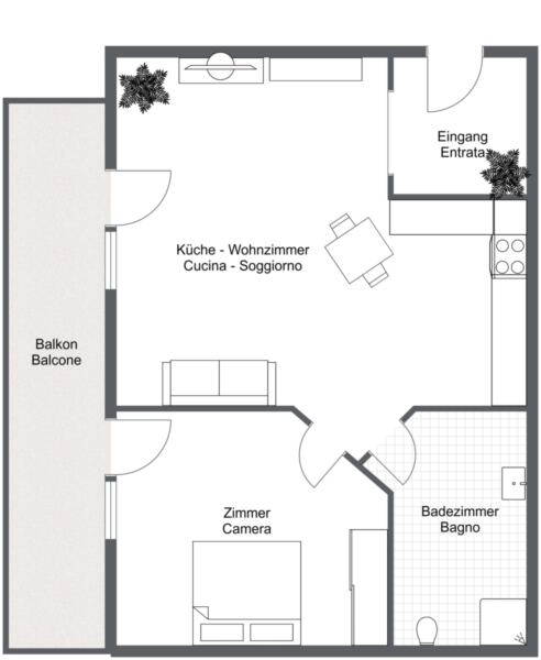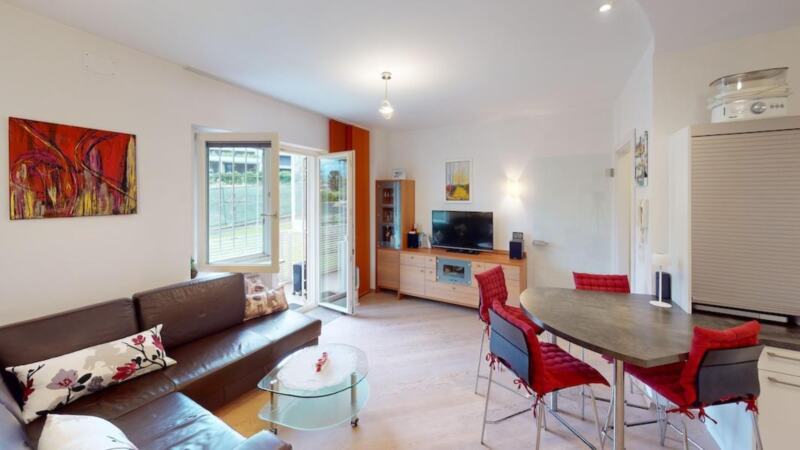 Die Wohnung verfügt über einen offenen Wohnbereich mit integrierter Küche, ein Badezimmer mit Dusche und ein gemütliches Schlafzimmer. Sowohl vom Wohnbereich als auch vom Schlafzimmer aus gelangt man auf die Terrasse und in den gemeinschaftlichen Garten. Dieser Bereich bietet exklusive Nutzungsmöglichkeiten, da sich in diesem Eck des Gartens nur diese Wohnung befindet. Ideal, um sich auf Liegestühlen zu entspannen und die Ruhe zu genießen.