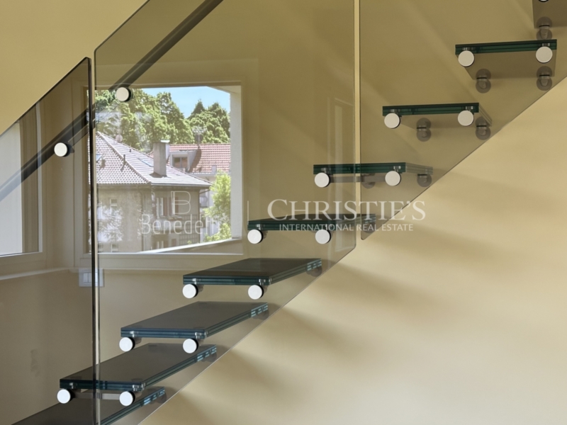 Eine neue Glastreppe führt Sie in das obere Geschoss sowie letztem Stockwerk, wo ein heller Vorraum den Weg zu einem weiteren, flexibel nutzbaren Raum weist, der sich ideal als Schlafzimmer oder gemütliches Wohnzimmer eignet. Von hier aus gelangen Sie auf einen kleineren Balkon mit Nord-West-Ausrichtung sowie auf die großzügige Sonnenterrasse mit herrlichem Süd-/Ostblick – ein Highlight für alle, die das Leben im Freien lieben. Ein weiteres modernes Badezimmer mit Dachfenster sorgt für zusätzlichen Komfort.
