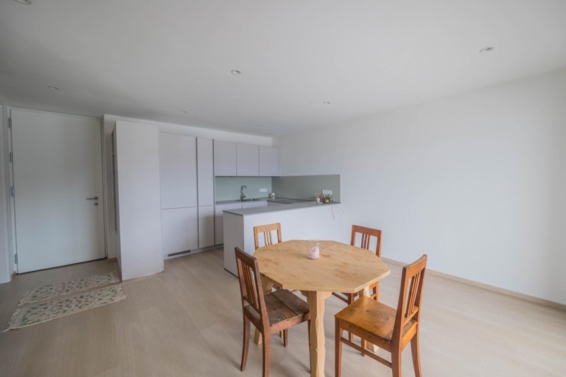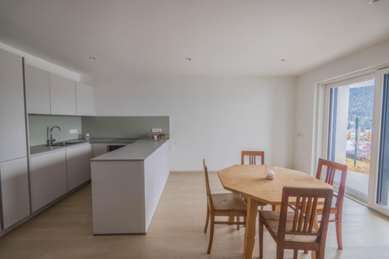 Die Küche ist bereits eingebaut und fügt sich harmonisch in den Wohnbereich ein, sodass einem sofortigen Einzug nichts im Wege steht. Ergänzt wird das Raumangebot durch einen Keller, der zusätzlichen Stauraum bietet. Zwei Stellplätze im Untergeschoss sind ebenfalls im Mietangebot enthalten und sorgen für komfortables Parken.