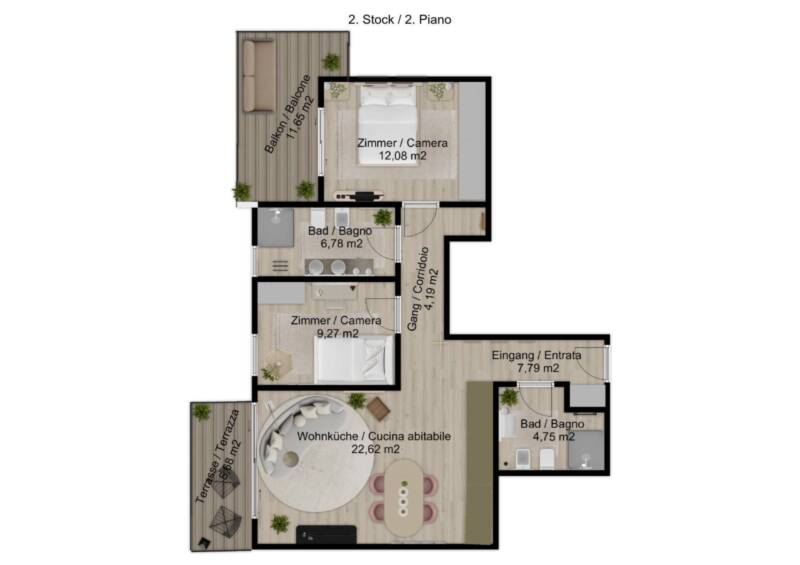 Diese neu gebaute 3-Zimmer-Attikawohnung im zweiten Stock eines Wohnkomplexes in Montan zeichnet sich durch ihre funktionale Raumaufteilung und hochwertige Bauweise aus. Der Eingang führt in den hellen Wohnbereich mit Wohnküche, von dem aus man direkt auf eine großzügige Terrasse gelangt ideal für entspannte Momente im Freien. Die Wohnung verfügt über ein Einzelzimmer und ein Hauptschlafzimmer mit direktem Zugang zu einer zweiten privaten Terrasse. Zwei moderne Bäder mit Dusche sorgen für maximalen Komfort und Funktionalität. Darüber hinaus bietet die Wohnung einen Dachboden, der sich ideal als zusätzlicher Stauraum oder für andere Bedürfnisse eignet.