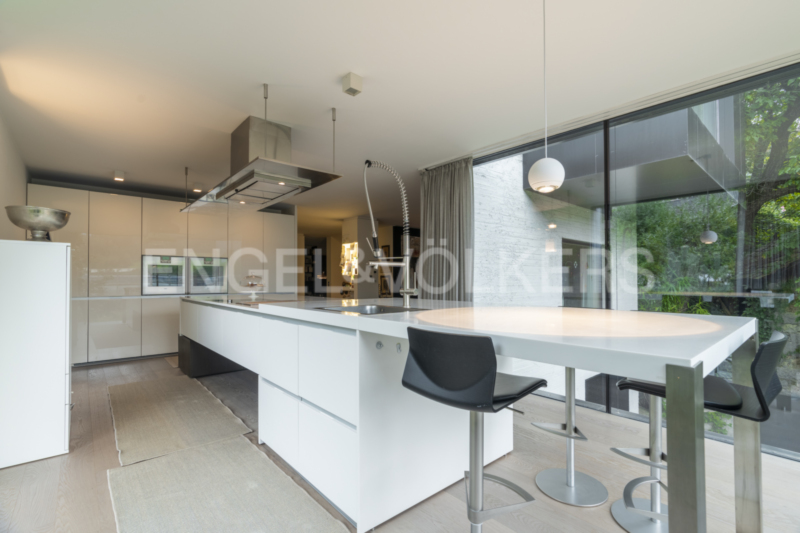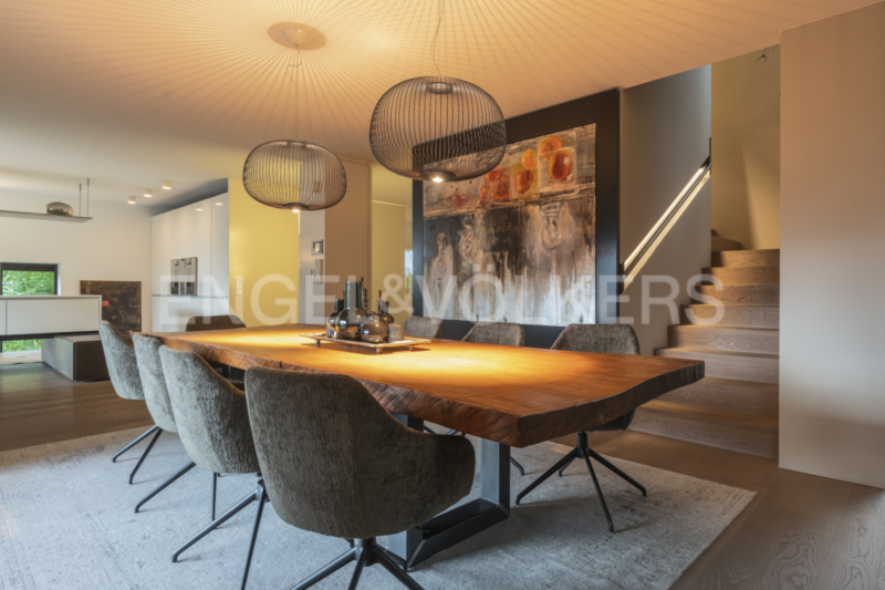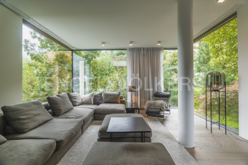 Entworfen vom renommierten Architekturbüro „bergmeisterwolf“, vereint diese exklusive Villa luxuriöses Design mit einzigartigem Lebensgefühl. Harmonisch eingebettet in die Landschaft fügt sich das markante Gebäude wie von Zauberhand in die Natur ein. Großzügige, raumhohe Glasfronten fluten die Wohnbereiche mit natürlichem Licht und schaffen einen Ausblick ins Grüne, wodurch die Natur zum festen Bestandteil des Wohngefühls wird. Ein elektrisches Tor führt auf das Anwesen und den stilvoll angelegten Garten. Neben mehreren Stellplätzen im Einfahrtsbereich verfügt die Villa über eine Tiefgarage mit bis zu 5 weiteren Stellplätzen. Der Zugang zum Gebäude ist bequem über die Tiefgarage und über den Haupteingang im Erdgeschoss möglich. Die Nutzfläche erstreckt sich über insgesamt 4 Etagen, welche alle mit einem modernen Aufzug verbunden sind. Der Polytherm Pool im Erdgeschoss zählt zu den Highlights dieser Villa. Die Sauna der Marke „Klafs“ und die Dusche komplettieren die private Wellnessoase. Das Erdgeschoss beherbergt zudem ein komfortables Gästezimmer mit Bad sowie einen praktischen Waschraum. Die Bäder wurden vollständig mit Elementen von Agape gestaltet - von Wasserhahn bis hin zur freistehenden Badewanne. Das mit schlichter Eleganz gestaltete Treppenhaus führt in das Herzstück der Villa: Im offen gehaltenen ersten Obergeschoss gehen Koch-, Ess- und Wohnbereich fließend ineinander über. Die elegante Boffi-Küche ist ausgestattet mit zwei Backöfen, einem Teppanyaki-Grill sowie einem Induktionskochfeld von Gaggenau. Die Villa überzeugt zusätzlich durch maßgefertigte Tischlerarbeiten von Barth und Erlacher. Im Masterbereich sorgen maßgefertigte Poliform-Schränke für großzügigen Stauraum, während auch der begehbare Kleiderschrank, die Bibliothek, das Kinderzimmer und das Esszimmer mit exklusiven Möbeln derselben Marke ausgestattet sind. Im Kellergeschoss befinden sich nicht nur die technischen Anlagen für das Hallenbad, sondern auch die Pellet-Heizung, sowie ein Weinkeller und mehrere zusätzliche Räume, die flexibel genutzt werden können. Modernste Technik rundet das Wohnkonzept ab: Eine vollautomatisierte Lüftungsanlage, elektrisch programmierbare Rollläden, eine Alarmanlage, eine zentrale Staubsaugeranlage sowie die Photovoltaikanlage auf dem Dach sorgen für höchsten Wohnkomfort.