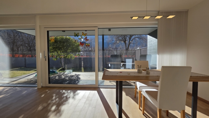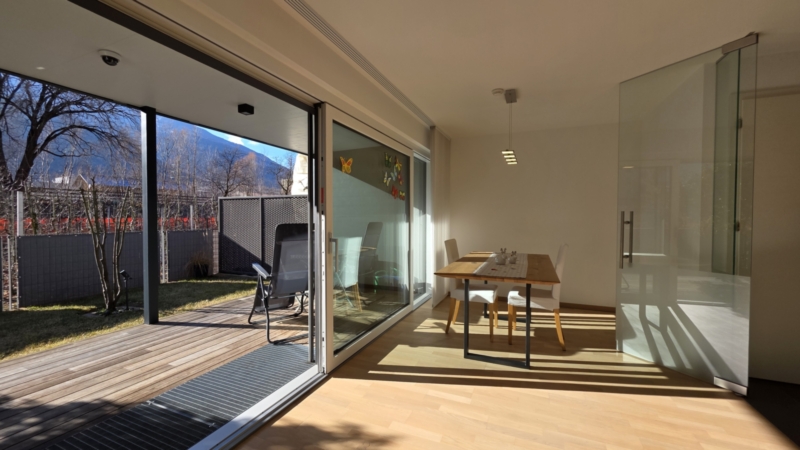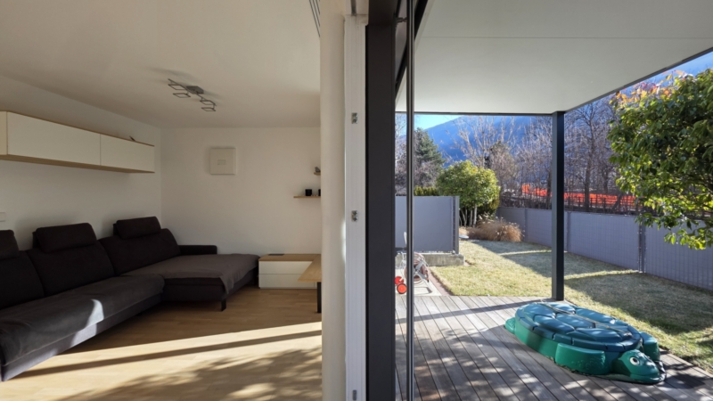 Großzügiger Wohnbereich mit beeindruckender Südfront-Verglasung und Schiebetür