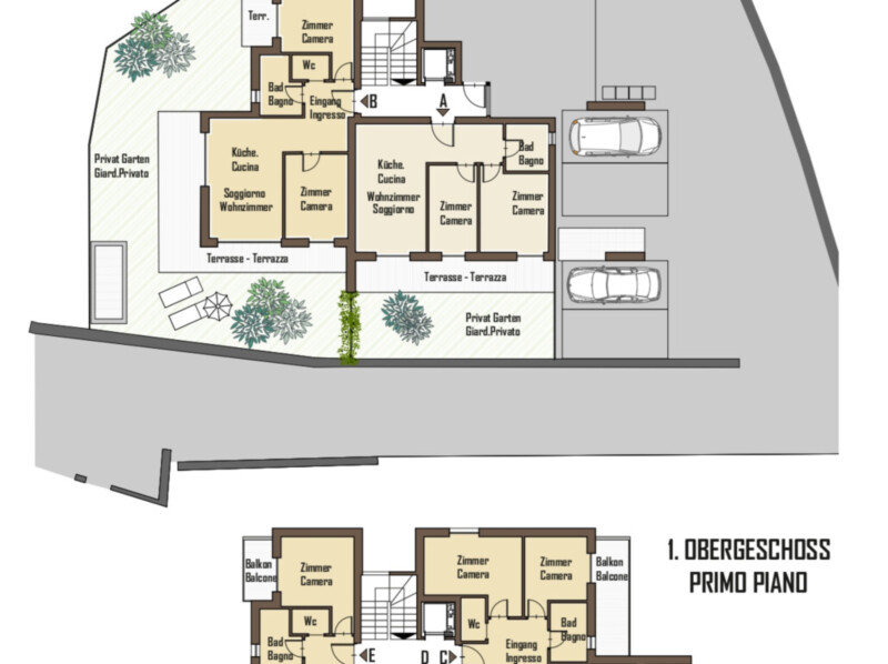Wohneinheit D: Zum Verkauf steht eine südausgerichtete Zweizimmerwohnung; bestehend aus Schlafzimmer, Wohnzimmer mit Küche, Bad, Terrassen u. Keller.