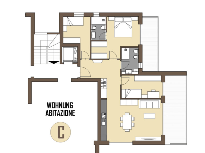 Wohneinheit C: Zum Verkauf steht eine süd-ost-ausgerichtete Vierzimmerwohnung; bestehend aus 3 Schlafzimmer, Wohnzimmer mit Küche, Bad mit Fenster, Tages-WC, 2 Terrassen u. Keller.